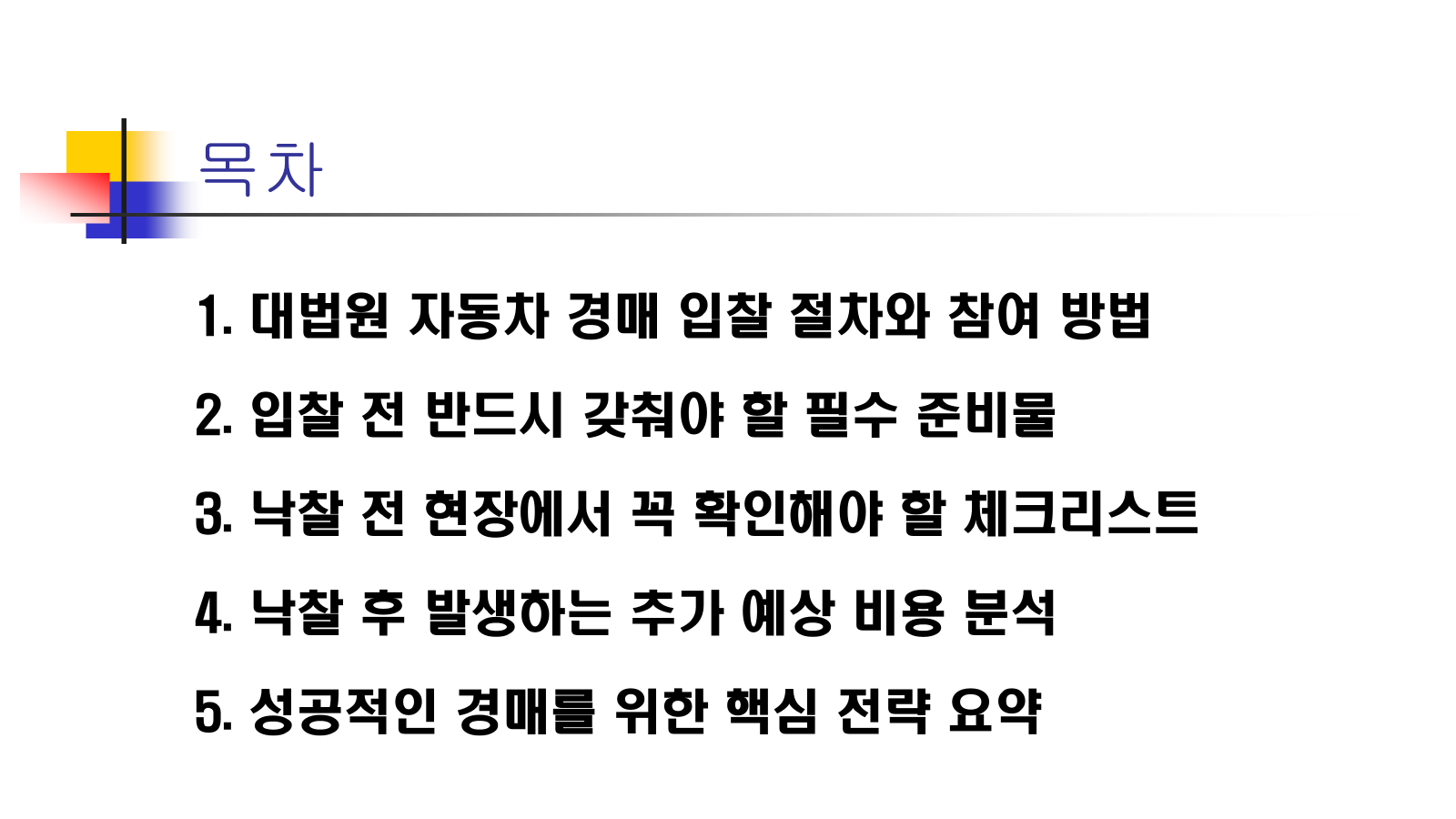 - 권리 분석 철저: 자동차 경매는 부동산에 비해 권리 관계가 단순하지만, 유치권 주장이 있는지 혹은 배당 절차에서 누락된 세금이 있는지 확인하는 습관이 필요합니다.