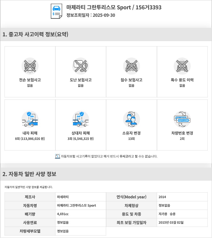 - 카히스토리(보험개발원)를 통해 사고 및 침수 이력을 반드시 조회하세요.