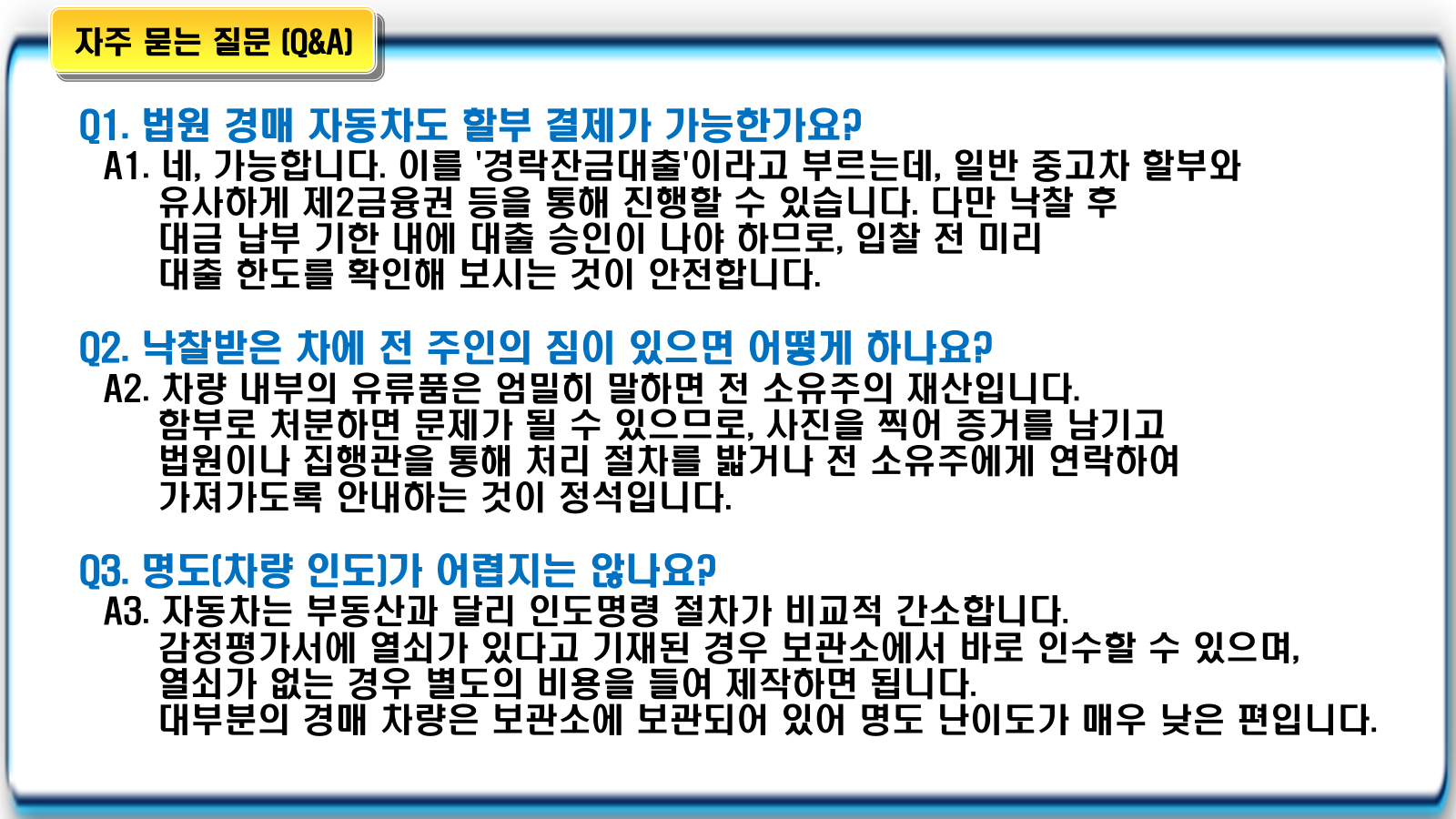 - 경매 차량은 방전된 경우가 많으므로 보관소 직원에게 점프 스타트가 가능한지 미리 문의하는 것이 좋습니다.
