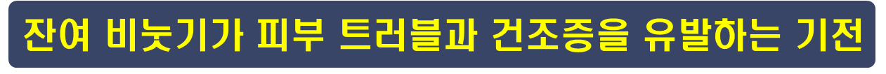 여름철이든 겨울철이든 샤워를 짧게 끝내는 것은 좋지만, 세정 후 비눗기가 피부에 남아있지 않도록 헹굴 때는 꼼꼼하게 신경 써야 합니다. 피부에 잔여 비눗기가 남으면 이는 피부 트러블과 건조증을 유발하는 직접적인 원인이 됩니다. 세정제에 포함된 계면활성제나 화학 성분들이 피부에 남아 지속적으로 자극을 주고, 피부의 수분 증발을 촉진하여 건조함을 심화시키기 때문이죠. 피부 표면에 남아있는 잔여물은 모공을 막아 염증성 트러블(여드름 등)을 유발할 수도 있습니다.