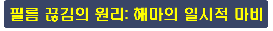 - 해마의 역할: 해마는 지름 약 1cm, 길이 약 5cm의 신경 뭉치로, 눈앞에 벌어진 사건들 중 무엇을 장기적 기억으로 남길지 선택하고 저장하는 중요한 역할을 합니다. 이 해마가 마비되면 새로운 사건이 장기 기억으로 저장되지 않는 일시적 기억상실증이 나타나게 됩니다.