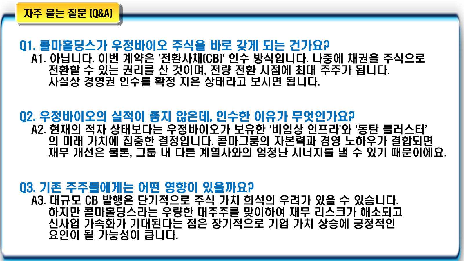 단순한 지분 투자를 넘어 경영권 확보까지 예고된 이번 움직임은 침체된 바이오 투자 시장에 새로운 활력을 불어넣고 있습니다. 과연 콜마홀딩스가 왜 적자 상태인 우정바이오를 선택했는지, 그리고 이 두 기업의 만남이 국내 신약 개발 생태계에 어떤 지각변동을 일으킬지 상세히 분석해 보았습니다.