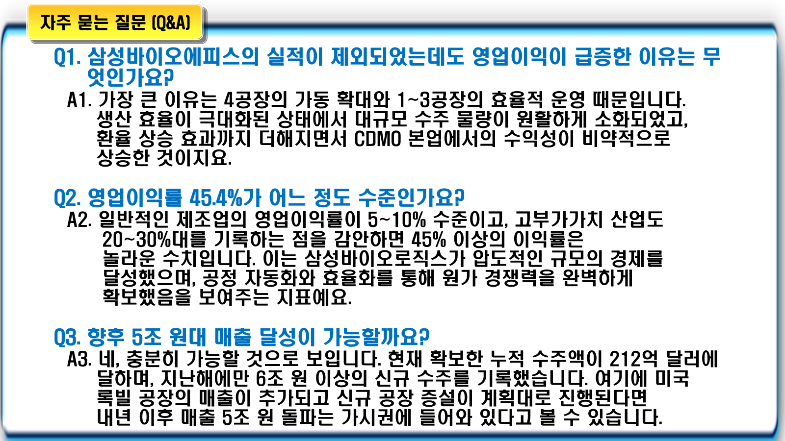 - 글로벌 공급망 재편 과정에서 안정적인 생산 능력을 갖춘 삼성바이오로직스로 물량이 집중되는 효과도 있었지요.