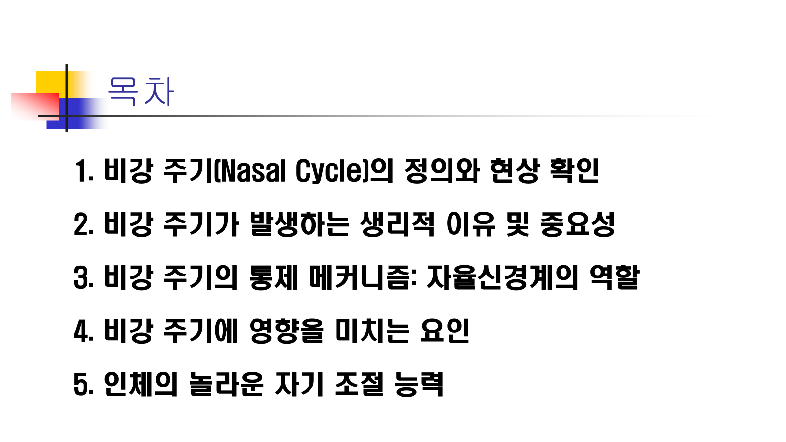 - 결과: 비강 통로가 좁아져 공기 흐름의 저항이 증가하고, 이 콧구멍을 통한 호흡 및 냄새 맡기는 비지배적 상태가 됩니다.