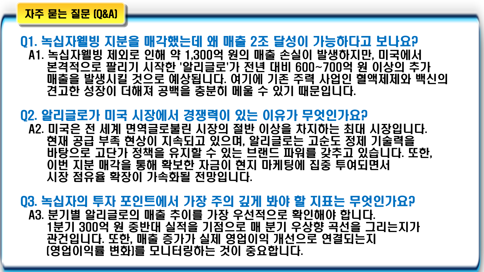 - 알리글로가 미국 시장에서 성공적으로 자리를 잡는다면, 전체 매출에서 차지하는 비중은 10%를 넘어 핵심 캐시카우로 자리매김할 것입니다.